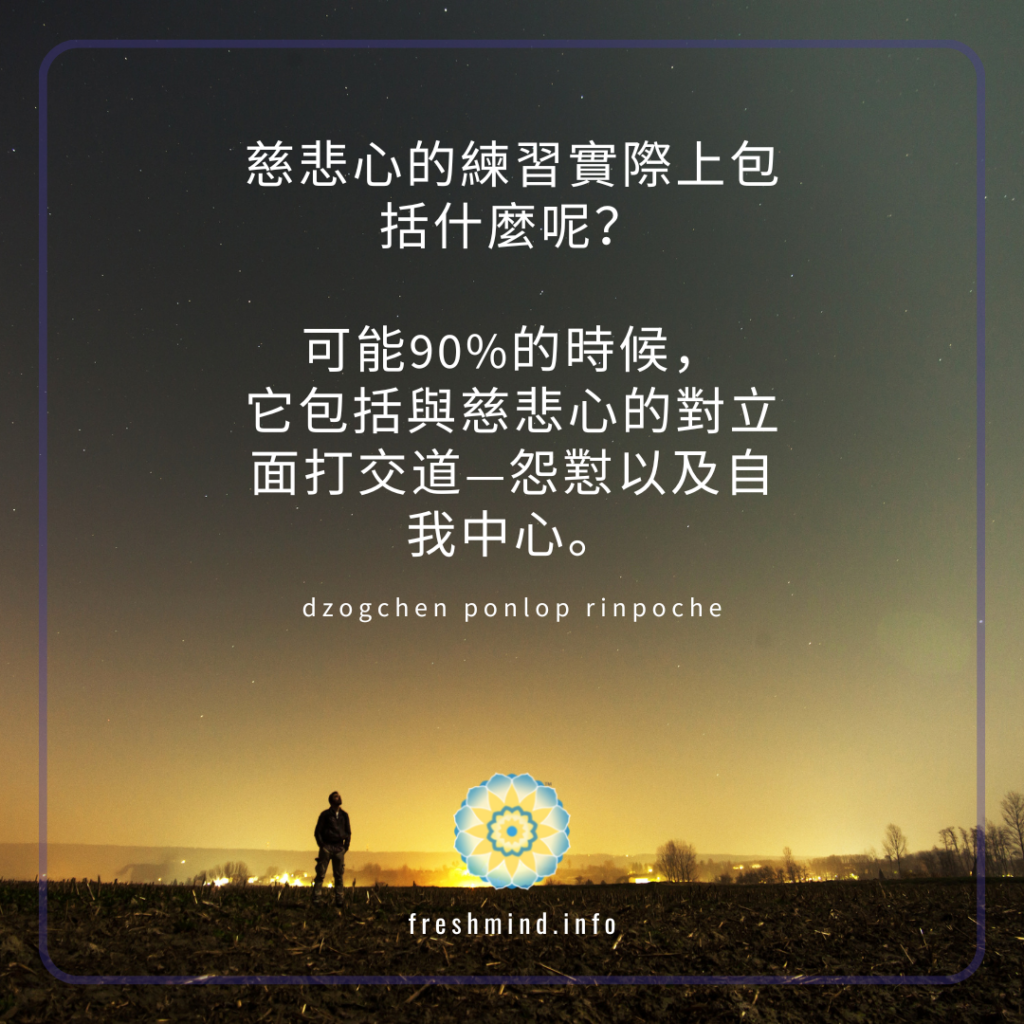 慈悲心的練習實際上包括什麼呢? 可能90%的時候,它包括與慈悲心的對立面打交道—怨懟以及自我中心。